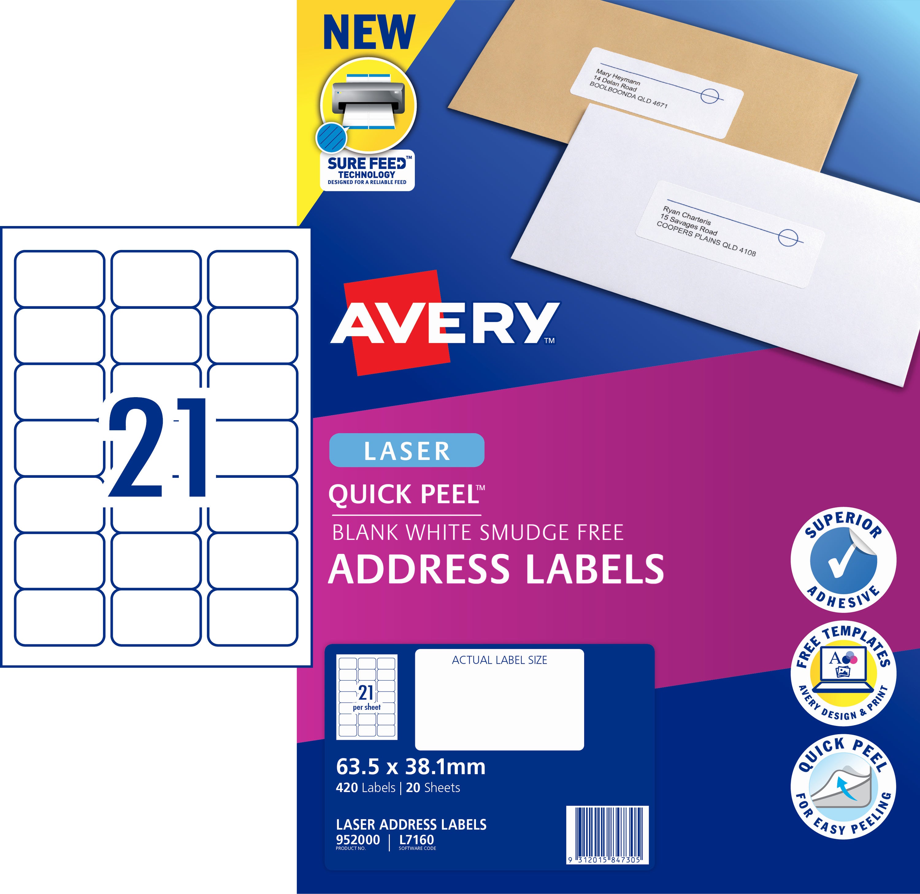 Word Template for Avery L7160 Word Template for Avery L7160 Address Labels, 63.5 x 38.1 mm, 21 per sheet Unterstützte Produkte Quick Peel Address Labels with Sure Feed - 952000 Quick Peel Address Labels with Sure Feed - 959001 Address Labels with Smooth Feed - 959090 Design & Print - Avery online templates - the easy way Blank and predesigned templates