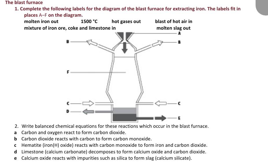 Solved The blast furnace 1. Complete the following labels - Chegg Complete the following labels for the diagram of the blast furnace for extracting iron. The labels fit in places A-F on the diagram. molten iron out 1500 °C hot gases out blast of hot air in mixture of iron ore, coke and limestone in molten slag out F D 2. Write balanced chemical equations for these reactions which occur in the blast,